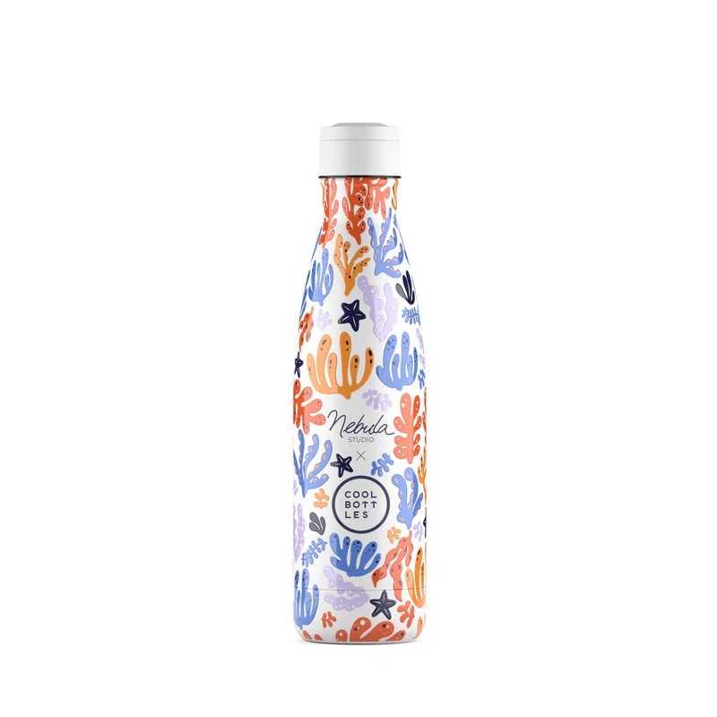 La bottiglia Underwater Fun ha un design vibrante ispirato agli elementi marini. Ci sono illustrazioni di coralli su toni di naranja, azuli e lillà, con forme organiche che riempiono tutta la superficie. Sin duda, estamos en el fondo del mar più colorato che esiste.