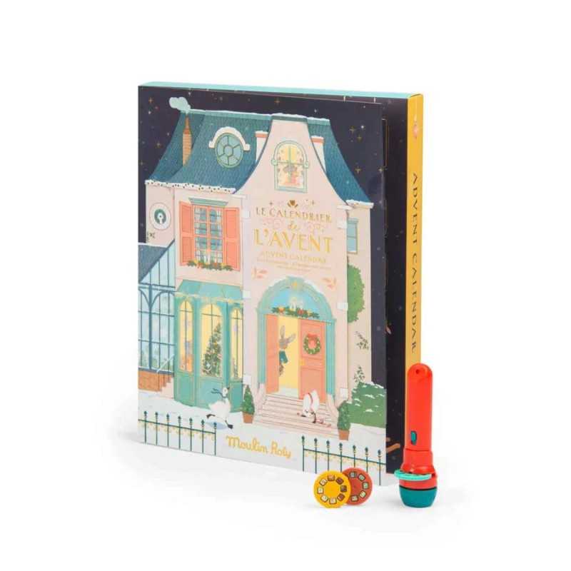 Calendario dell'avvento con illustrazioni della collezione di Moulin Roty. Contiene una lampada proietta storie e 23 dischi. Immagini di 11 collezioni iconiche Moulin Roty da scoprire.
