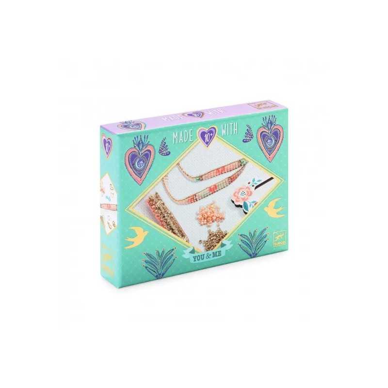 In una bella scatola lucida, è incluso tutto il materiale per realizzare due graziosi braccialetti usando un telaio! Seguendo i passaggi e i modelli del libretto, i bambini tessono le piccole perline colorate sul telaio. Due gioielli da custodire o da regalare in un grazioso sacchetto di organza. E per conservare ancora più ricordi, sono inclusi due biglietti illustrati per scrivere dolci parole.