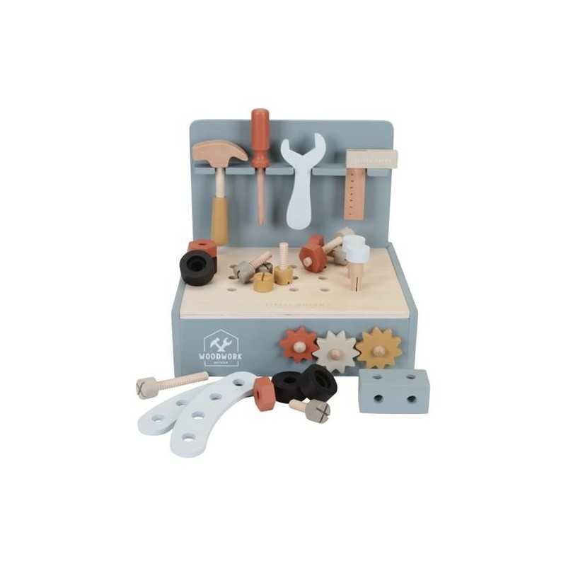 Questo mini banco da lavoro è compatto e facile da spostare. In questo modo, puoi martellare, segare e costruire ovunque tu voglia. Puoi usare le viti e i bulloni inclusi per costruire un veicolo fantastico. Pronto per le tue faccende? Basta mettere in ordine i tuoi attrezzi e far scorrere la scatola di legno per chiuderla. Usa il mini banco da lavoro insieme al grande banco da lavoro per divertirti ancora di più con le costruzioni. Il set del mini banco da lavoro contiene 26 componenti.