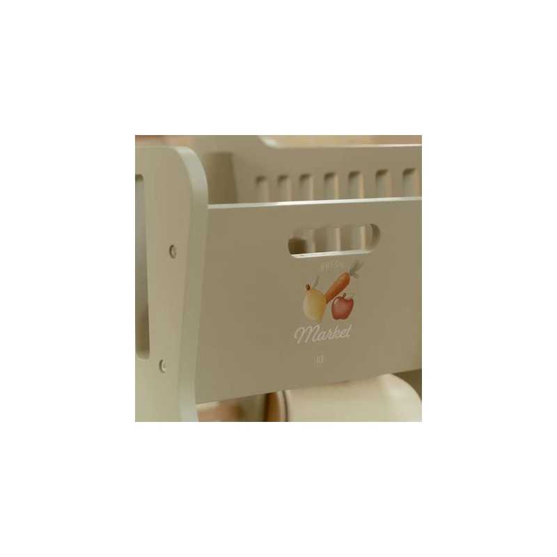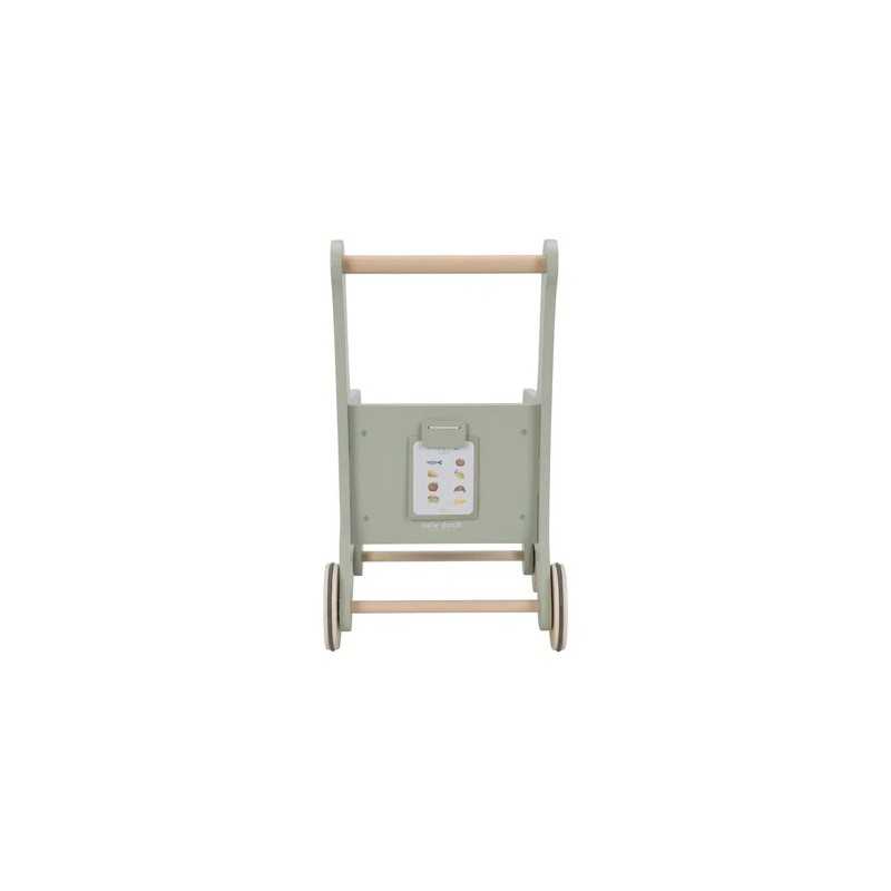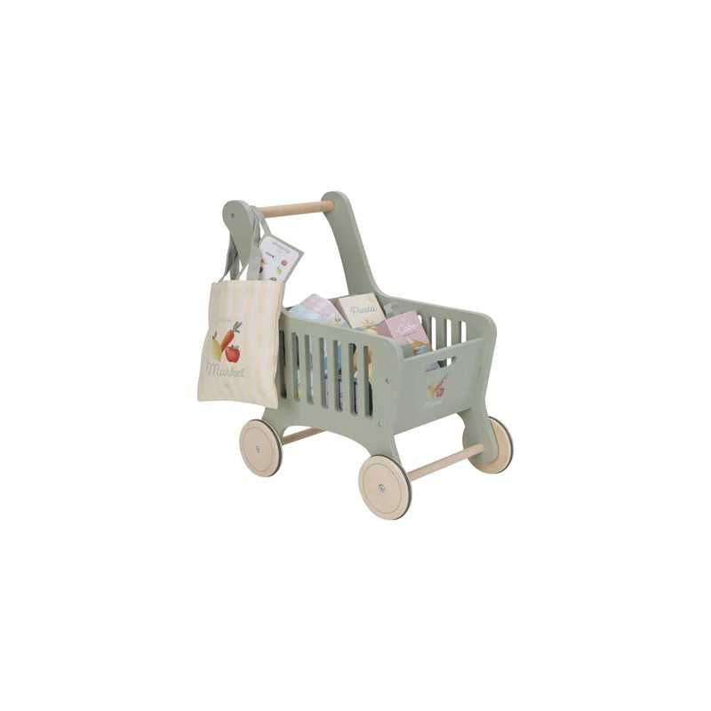 Il bellissimo treno in legno di Little Dutch è illustrato con una gallina e i suoi pulcini.