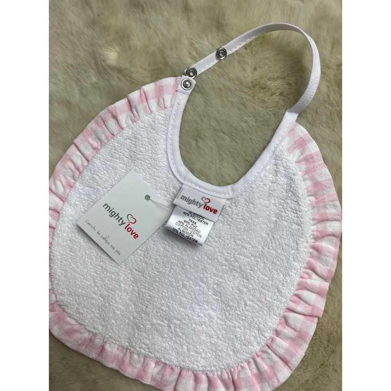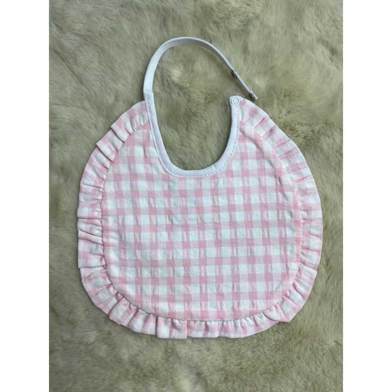 Proteggi i vestitini del tuo bambino con questo bavaglino neonato in cotone, dal design elegante e pratico. Realizzato in tessuto morbido e assorbente, è perfetto per mantenere il tuo piccolo sempre pulito durante i pasti o la dentizione. Il motivo a quadretti rosa e bianco, unito al bordo arricciato con volant, dona un tocco di dolcezza e raffinatezza.