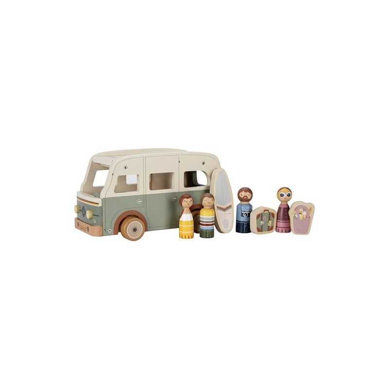 Sali sul tuo camper e preparati per una bella giornata in spiaggia o per un viaggio con la tua famiglia. Non dimenticare di portare la tua valigia, la borsa da spiaggia e la tavola da surf! Il tetto di questo camper vintage in legno può essere rimosso, così le 4 statuette di legno si adattano facilmente all'interno. Puoi aprire il portellone posteriore per riporre i tuoi bagagli nel bagagliaio del camper. Questo set di gioco completo stimola il gioco fantasioso.
