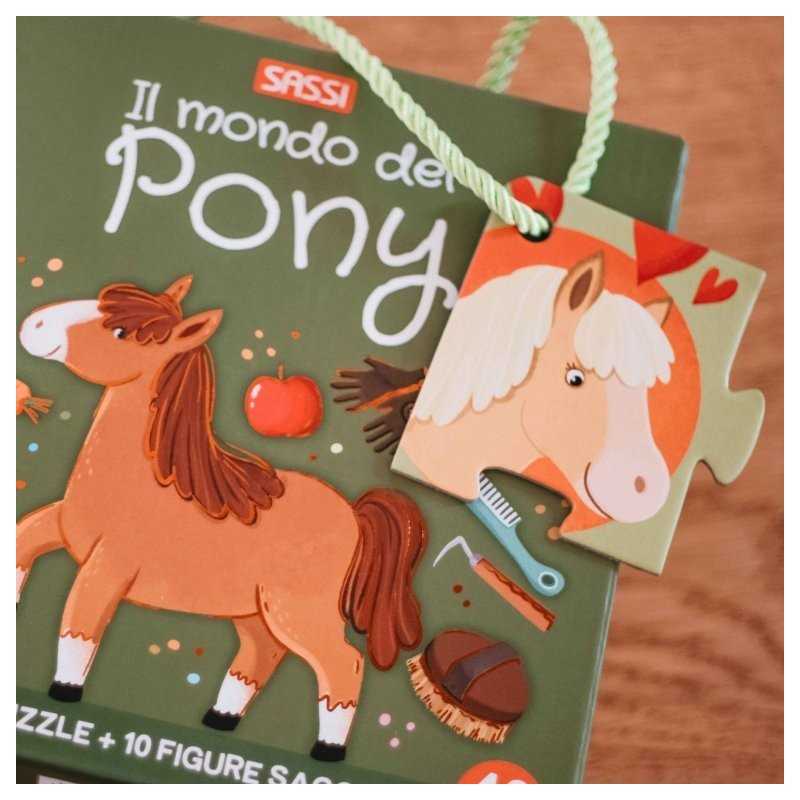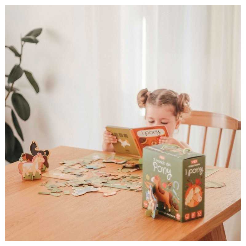 Una scatola con dettagli iridescenti che contiene un libro di 10 pagine, un puzzle di 40 pezzi e 10 figurine sagomate da assemblare e posizionare sul puzzle, per imparare a riconoscere e ad associare elementi e parole. Scopri tutto sui pony!