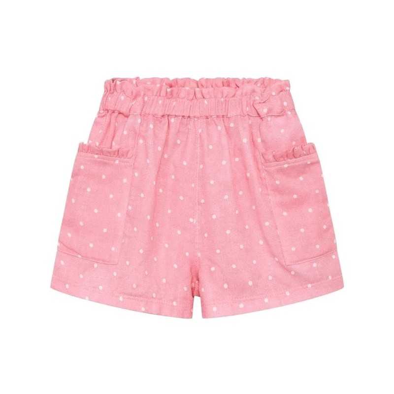 Shorts in cotone intrecciato con pois e vita elasticizzata. Presenta tasche anteriori e posteriori, decorate con volant. Questo prodotto è realizzato in 100% cotone biologico.