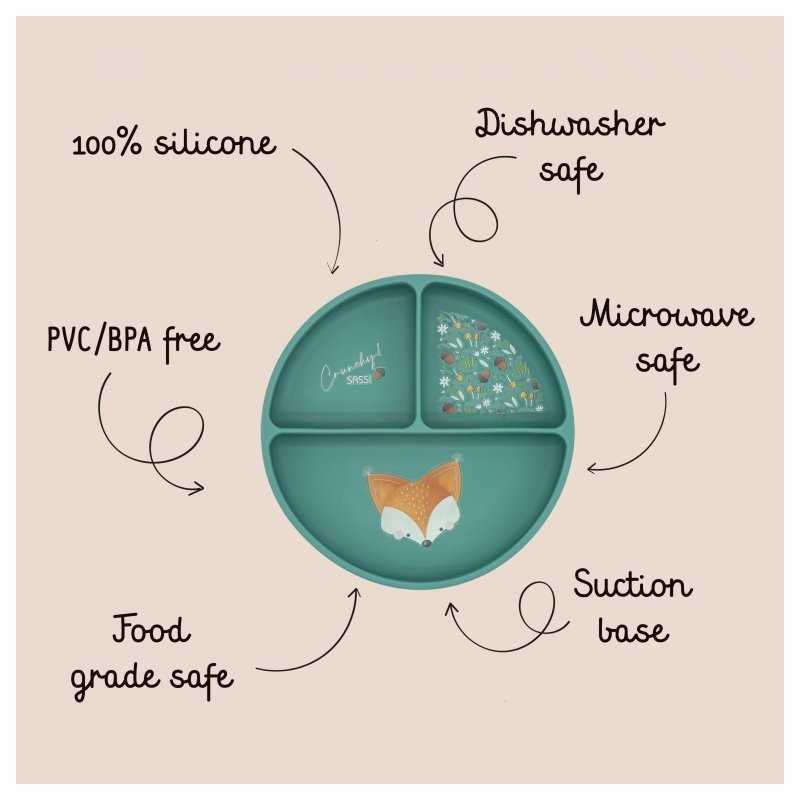 Piatto in silicone per lo svezzamento dotato di ventosa e decorato con la graziosa volpe Crunchy.