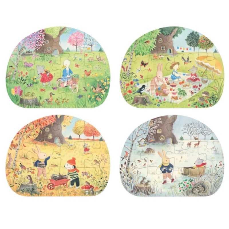 Alla scoperta delle stagioni! Cofanetto contenente 4 mini-puzzle da 12 pezzi ciascuno, con illustrazioni della gioiosa compagnia che è La Grande Famille. Ogni puzzle viene fornito con un modello di poster per aiutare i bambini.