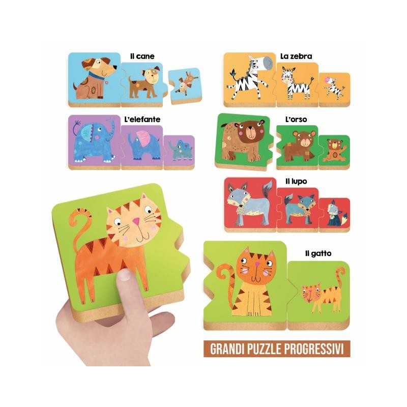 3 simpatici puzzle a tema animali marini con difficoltà progressiva, rispettivamente da 4, 6 e da 9 pezzi.